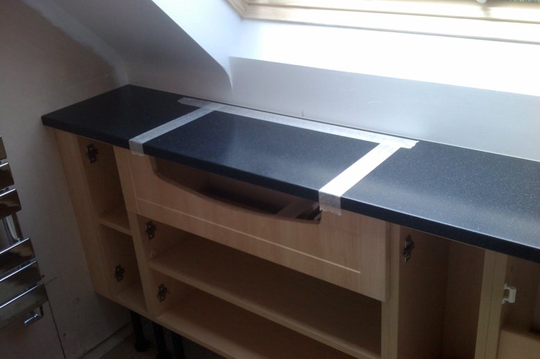 To mark the sink cut-out I put masking tape on the worktop so I can see them my markings when cutting. Because there's a slight overhang at the front, I had to allow for this and add it onto what I was cutting out of the back so the sink would slide right up to the cabinet fascia.